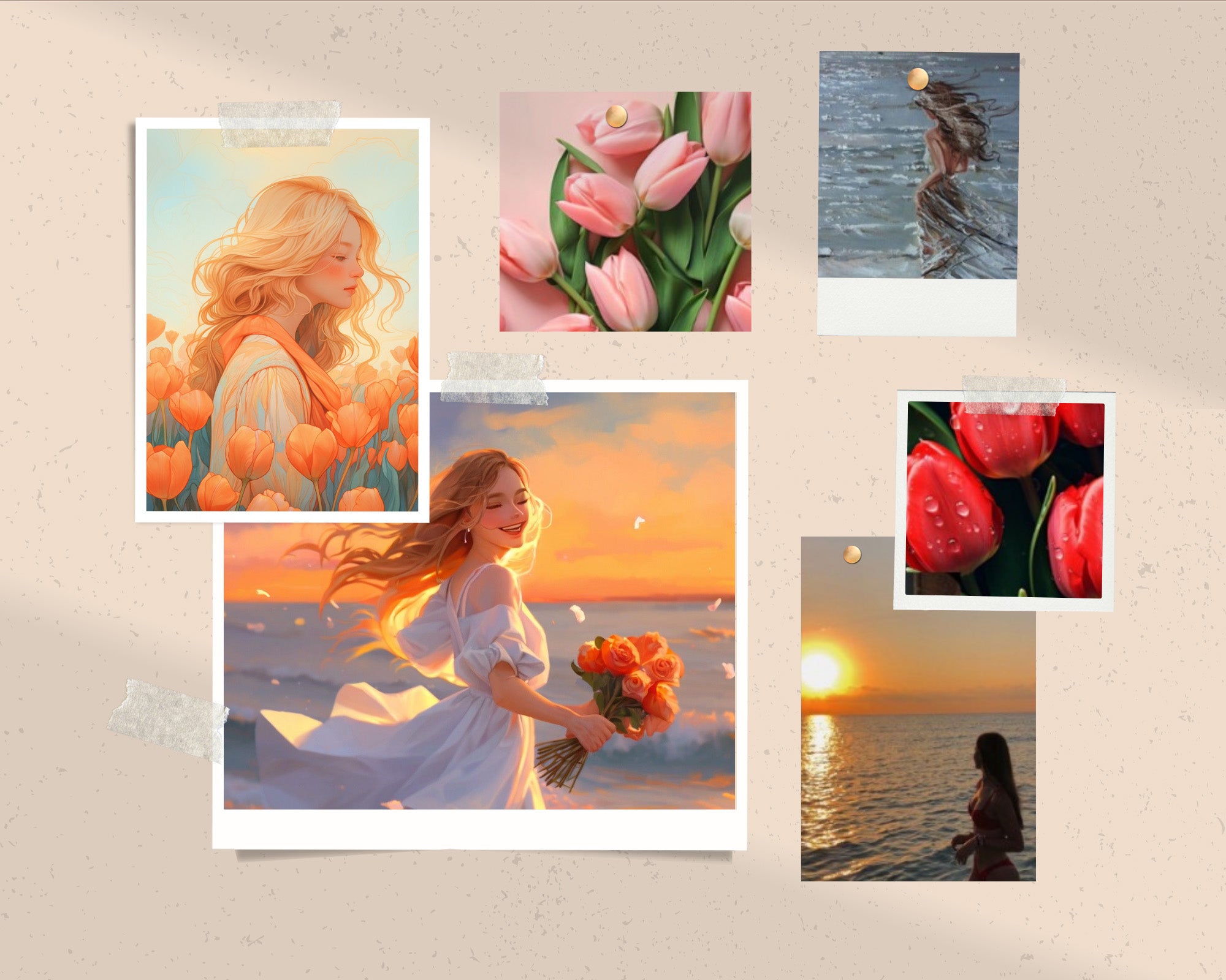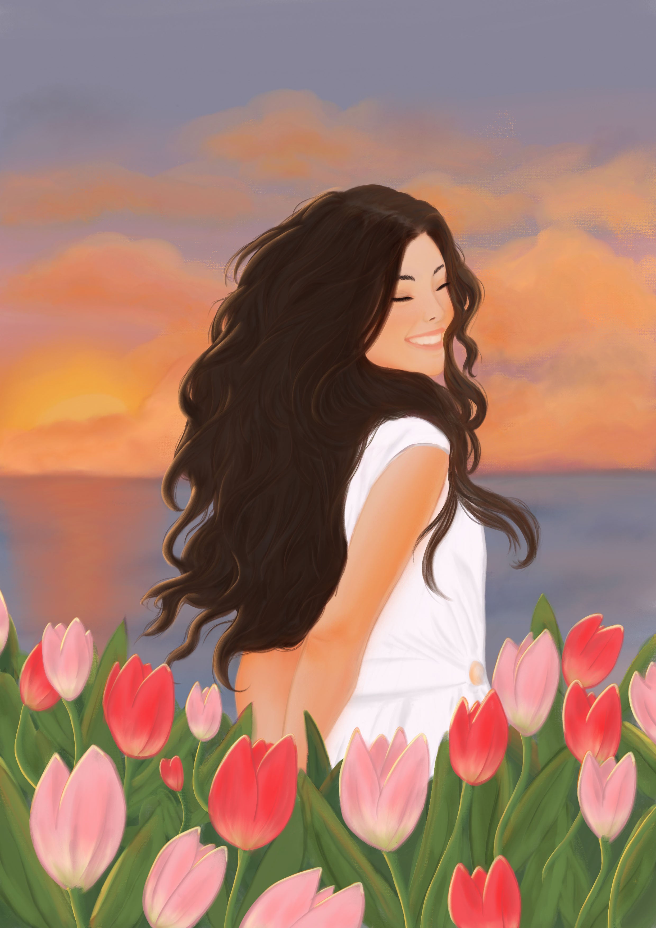 Mer, couché de soleil, tulipes